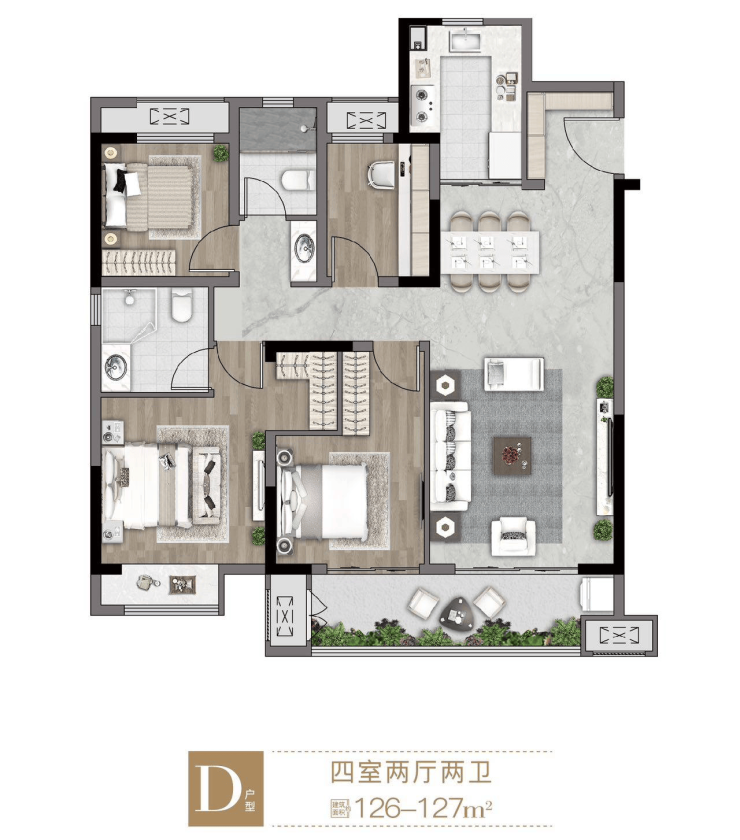 考究设计:8栋总高18层纯小高层组团,双“1”字形排布,采光通风效果达到最佳,户型设计97-143㎡,得房率约76%-77%,兼顾居住舒适度及房屋总价控制。景观大师山水比德操刀,一环、两轴、五园景观节点分布宅间,匠做城市新奢美宅。