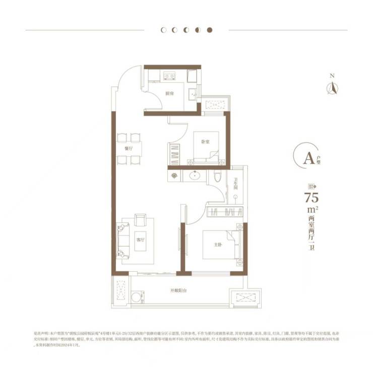 悦辰苑A户型∶建面约75㎡两房两厅一卫