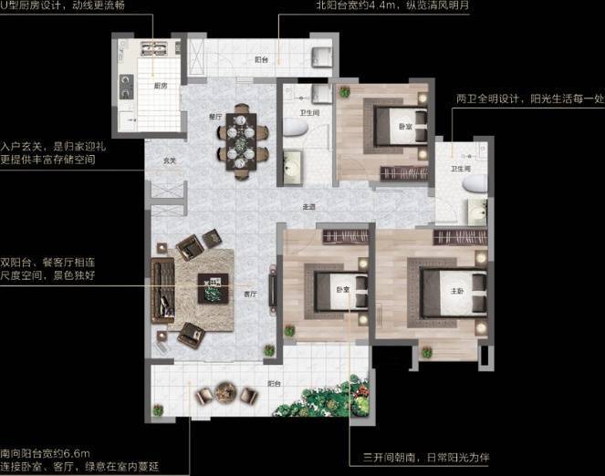 私密性佳户型四面宽朝南,南北双阳台,通风效果好;餐厨一体,客厅与阳台、餐厅相连,空间感大;主卧与另外两次卧完全分开。
