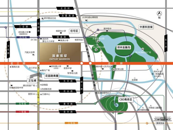 金北环之上 中央生活坐标 ,横跨花园路至经三路黄金地段 ,左拥正弘城、国贸360、建业凯旋广场等黄金商圈,右抱北龙湖金融岛、CBD,10 分钟即可通达郑州最高端最具人气的核心地点