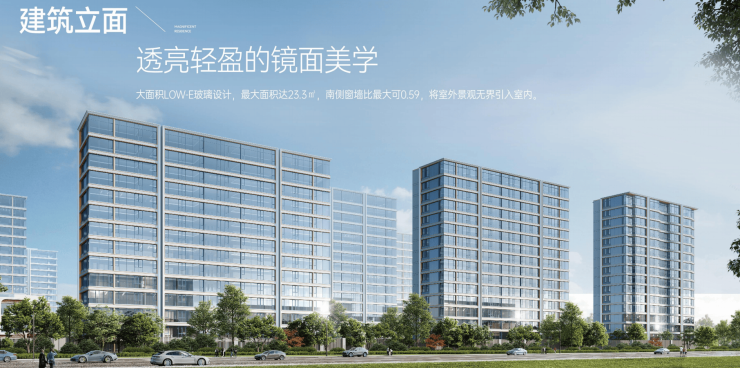 【春月锦庐】立面创新性的采用南北双立面,南向超扁平立面设计,窗墙比最大0.59,赋予生活更为丰盈的自然光境,北向设置生活阳台,并采用大量玻璃镜面,构成南北皆美的独特艺术界面。