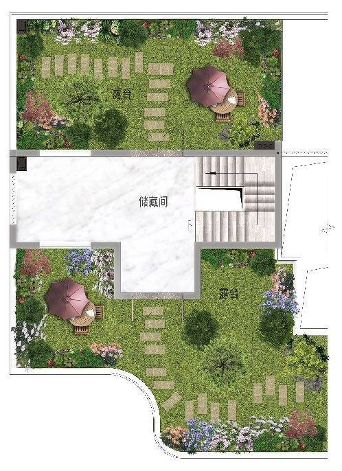 下叠1层平面图U型厨房空间利用率高,提供高效的操作空间中岛式厨房方便操作,增加互动,增加生活乐趣餐客一体,超大空间入口玄关对景玄关,加强入户体验私家花园南北双向私人花园尽享自然