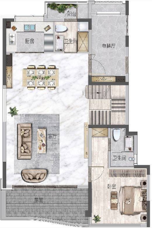中叠3层平面图U型厨房空间利用率高,提供高效的操作空间中岛式厨房方便操作,增加互动,增加生活乐趣前室完整的前室,增加入户体验感,餐客一体,超大空间向南大露台南向两开间超大露台,270°观景,舒适美观