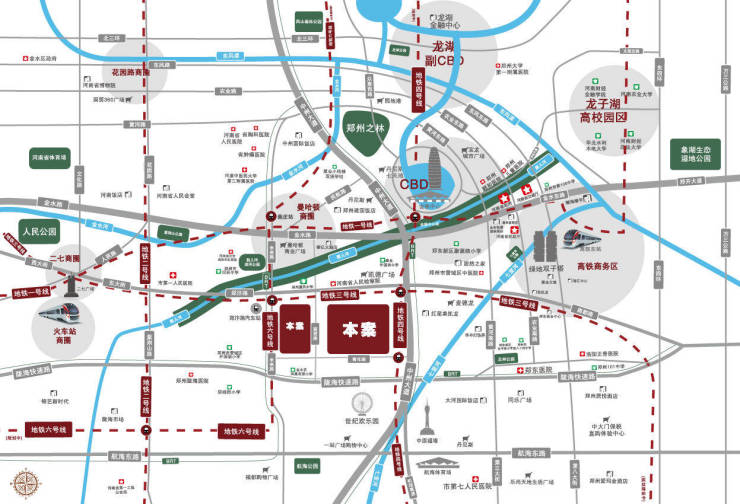 位于金水区、郑东新区、管城区和经开区四区枢纽要地,中州大道和陇海快速路两大城市主轴之间,3/4/6号地铁环绕。紧邻郑东新区CBD,距离会展中心约2.8公里,家门口12000㎡城市绿地,真正坐享主城区成熟繁华配套。