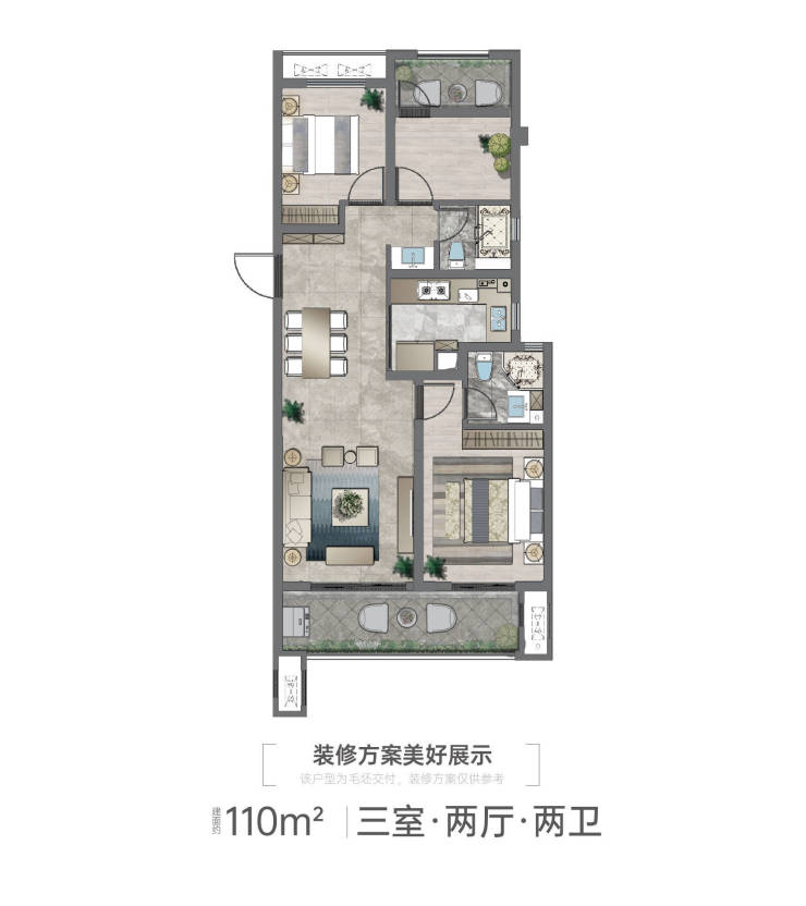 【约110㎡三室两厅两卫】:南北通透+南向6米奢阔阳台+套房式主卧+阖家欢喜的奢适3房