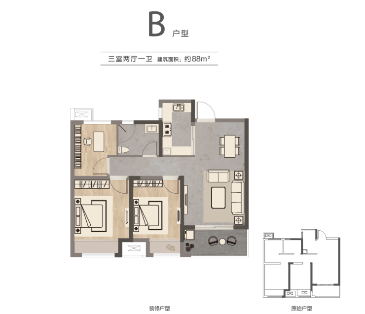 B户型:建面约88㎡(三室两厅一卫)