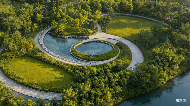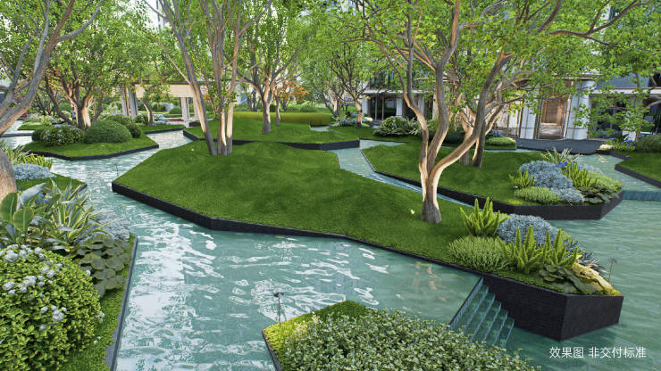冲刷·河育森境|蜿蜒溪流穿行石滩绿岛,融合亲水平台,演绎精工度假美学。