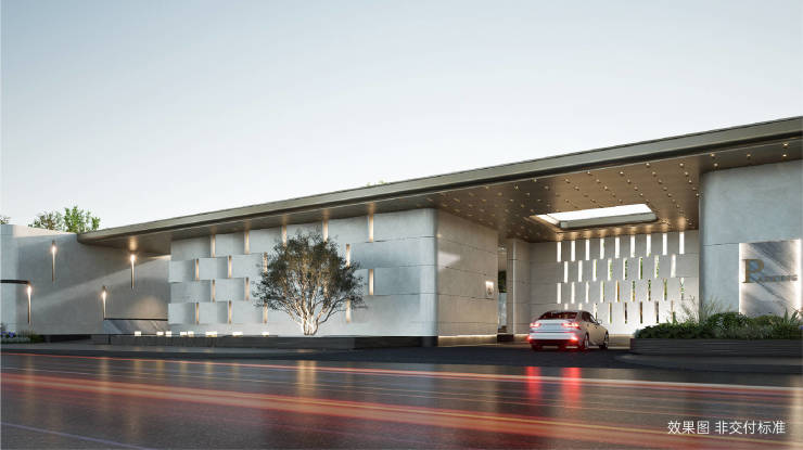 归家大门以约75米的超长界面铺展,宛如一幅展开于天地之间的迎宾画卷。南北延展的界面铺陈贝金米黄石材,温润底色间,景墙的流线造型与渗透的灯光相映成趣,将归家入口的雅奢氛围悄然融入其间。