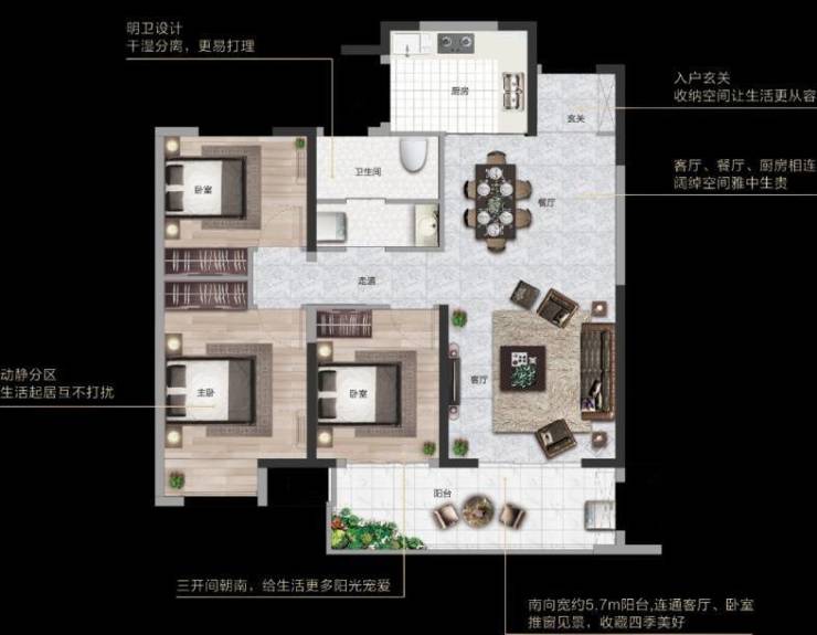 主流户型方正全明户型,南北通透;以客厅为中心,采用动静分离的设计理念,餐厨一线,主次卧相对分开。