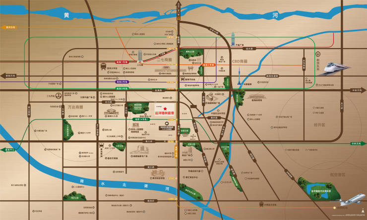 项目位处郑州城市发展黄金中轴--紫荆山路,周边商业、医疗、教育、金融等资源聚集,2公里范围近享醇熟生活,橄榄城都市广场、二七万达等商圈在侧;