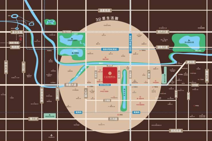 【交通】项目南临商都大道,东临占杨路,北至滨河路,紧邻贾鲁河滨河公园,出门即享河景配套,交通出行非常便捷。规划地铁20号线,公交888直达郑州东站(已运营),项目距离万三公路(郑州的东五环)仅3分钟车程,距离京港澳高速莆田收费站仅17公里,距离郑东高铁站仅16公里,30分钟车程均可抵达