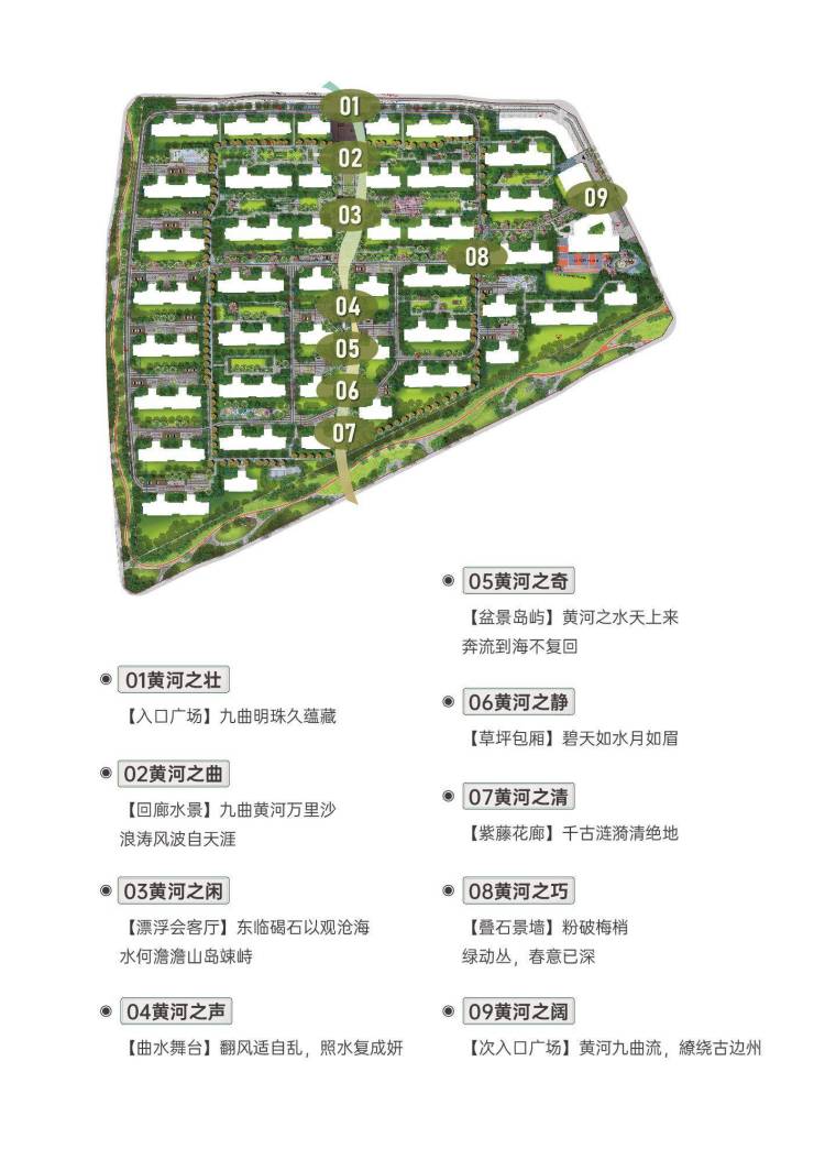 北龙湖九如府原班景观设计团队——上海北斗星执笔,汲取黄河之美,括黄河之景,蕴河畔之情,绘制300米景观中轴,营造河岸上的心灵栖息地。