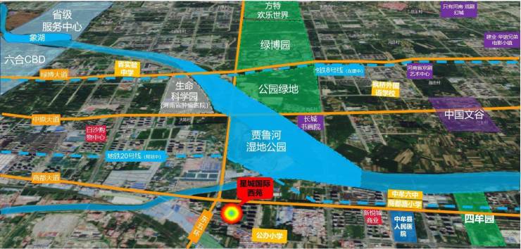 方特欢乐世界、建业电影小镇、海昌极地海洋馆、郑汴中央公园、绿博园、圃田泽(项目对面,占地800亩)
