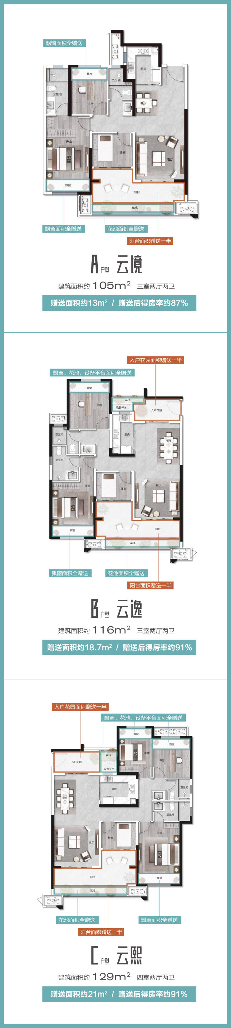 约105-129㎡越级产品,通过L型阳台、空中花池、设备平台、飘窗等空间赠送,最高约91%得房率,兼顾实用性与舒适感,让整体生活更加从容有度。