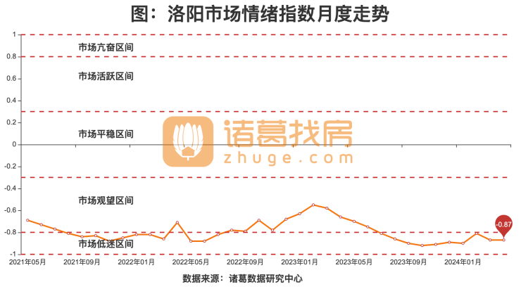根据诸葛找房数据研究中心监测数据显示,2024年04月,洛阳市场情绪指数为-0.87,较上月持平,位于市场低迷区间。