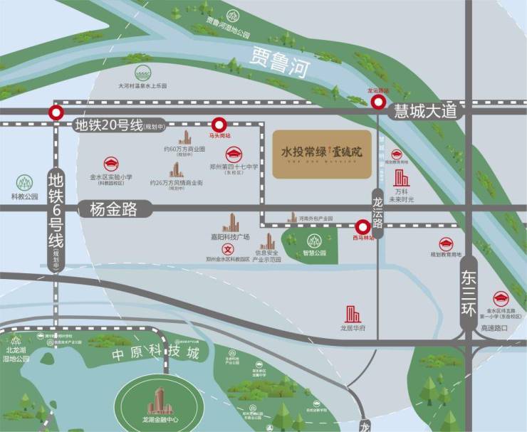 2、项目近邻贾鲁河畔,紧邻慧城明渠(规划中),贾鲁河湿地公园、明渠市政公园、智慧公园,优质生态鲜氧浸润,成就全家人的养生日常。